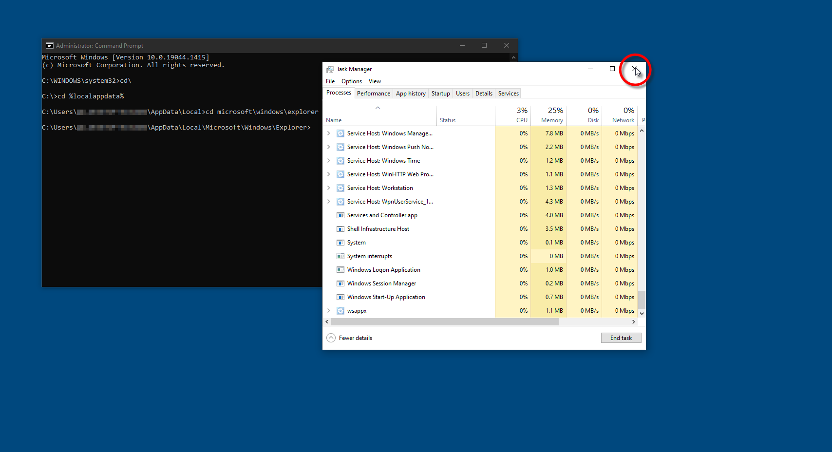 The entire screen will turn blank, except for the command prompt window and the Task Manager window. Now close the Task Manager window, so that there is nothing but the command prompt window up on the screen.