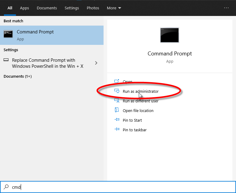 Open an elevated command prompt by clicking the Windows Start menu and typing "CMD". Select the Run as Administrator option.