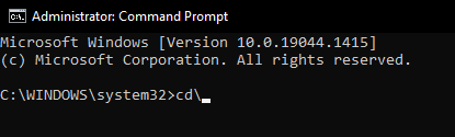 The command prompt will open at the C:\Windows\System32> prompt. Jump to the root of the C:\ drive by typing the following command: