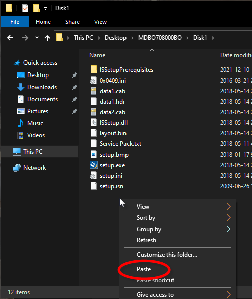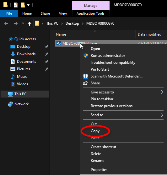Open the MDBO708000xxx folder, then right-click the MDBO708000xxx.exe file and select Copy.