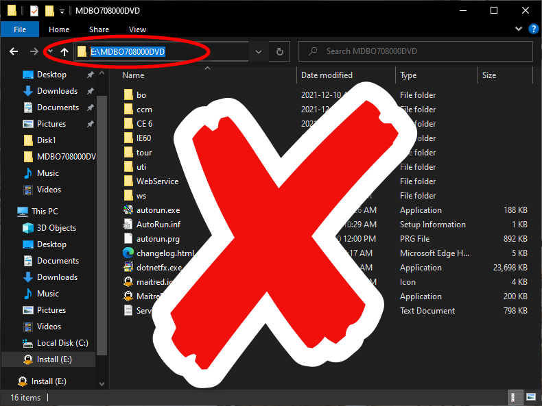 Installer files are located inside a folder, in E:\MDBO708000DVD.