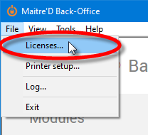 On the Main Back-Office screen, click on the File menu and select the Licenses… option.