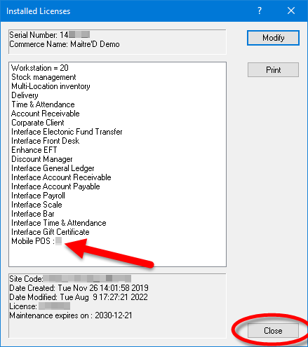 After your Maitre'D license has been activated, it is possible to add new options to it, to keep up with your business' growth. For instance, you could add a new module such as the Inventory Management module, or increase the number of POS workstations to meet your needs.