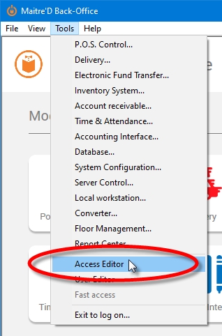 The Access Editor is located under the Tools pull down menu in the main Back-Office screen.