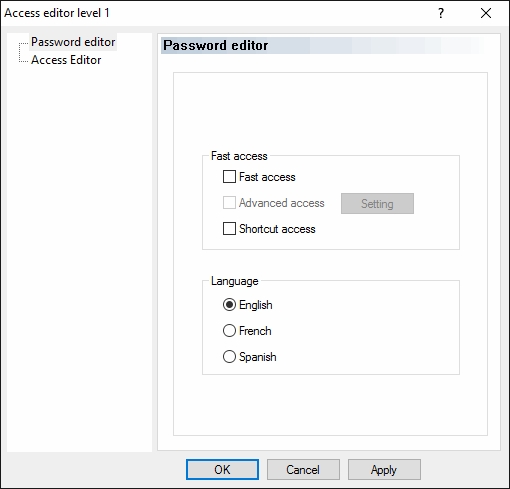 Fast Access Settings are accessed by clicking the Settings button on the Password Editor Screen. This dialog allows you to setup the tasks that users will be able to perform.