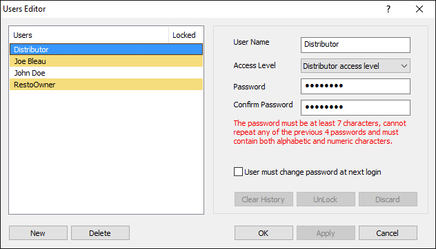 After 5 unsuccessful login attempts, Maitre’D will automatically lock the user account. To unlock an account, someone with Distributor or System Owner access needs to login, access the user editor, select the locked account and click the Unlock button.
