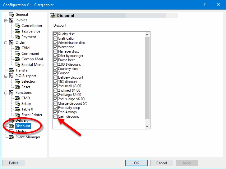 The configuration opens. Click on the Discount branch and enable the Cash Discount by ticking the checkbox next to the discount.