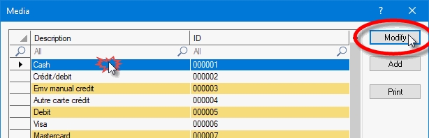 The list of available media types will appear. Select the Cash media type and click the Modify button.