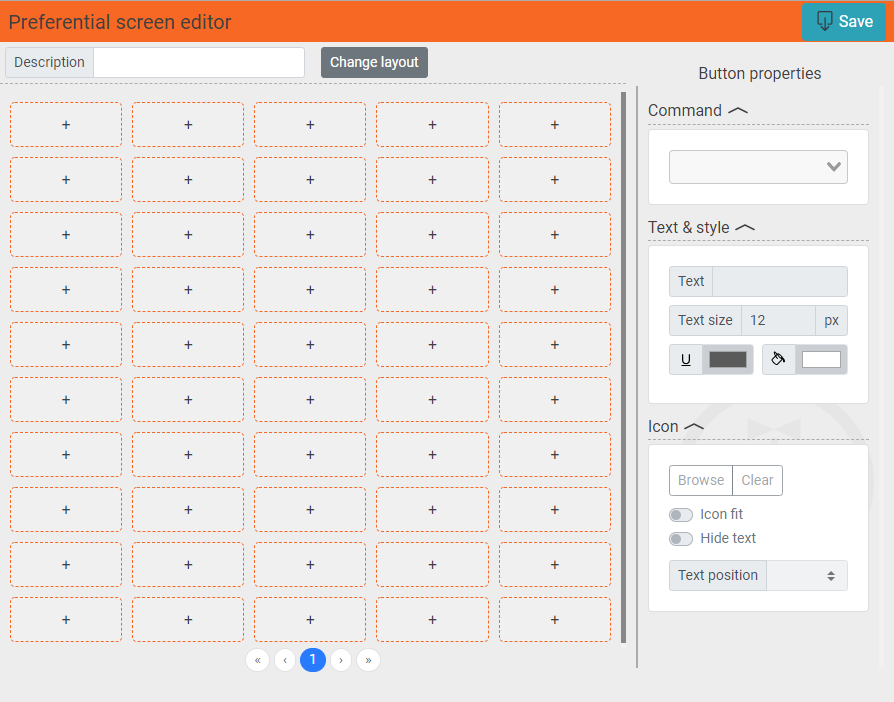 To add a single button to the screen layout, simply click on the button outline you wish to configure. The button will become highlighted and this will give you access to the Button properties toolbar on the right-hand side of the Screen layout editor.