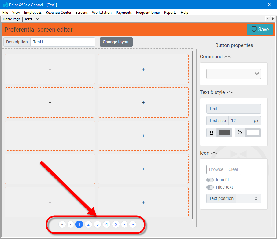 NOTE: To cycle button pages at the POS, you need to create navigation buttons on a screen layout, using the Next Preferential Screen and Previous Preferential Screen commands.