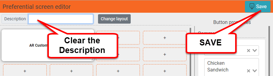 Type a meaningful description for this preferential screen. The description should provide a clear indication as to what this preferential screen is used for, like "Delivery", "Grill" or "Pasta" for instance. This field supports up to 20 characters.