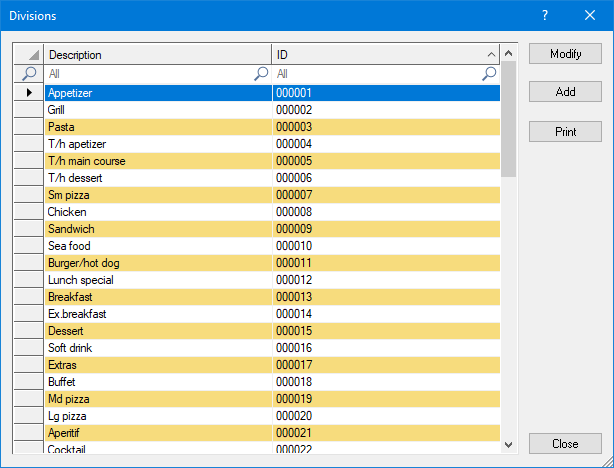 Click the Close button to exit the divisions list and return to the Point of Sale Control module.