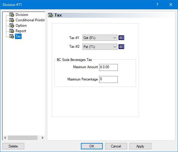 The divisions used for sodas are taxable by both the GST (5%) and PST (7%). Here are the required settings: