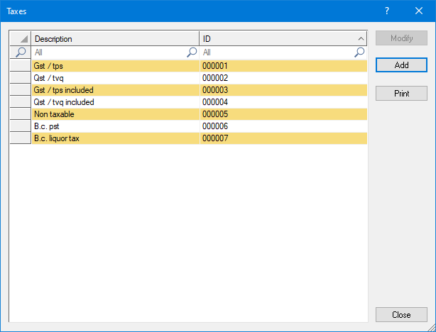 Click Print to generate a report of all available taxes, which can be printed.