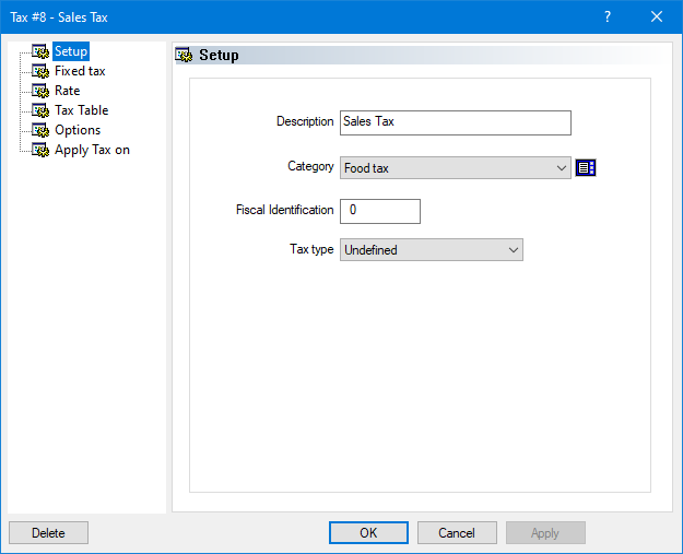 When a new tax is created or when an existing tax is modified, the tax properties open on the Setup branch.