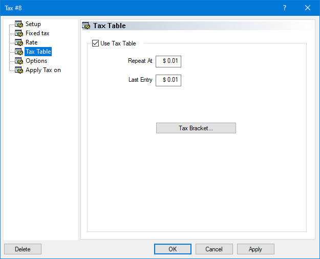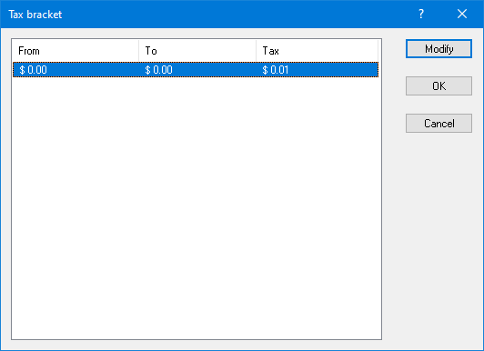 Click the Tax Bracket... button to access the tax table and modify each entry in the table. You will need the tax table provided by your local tax authorities for this task.