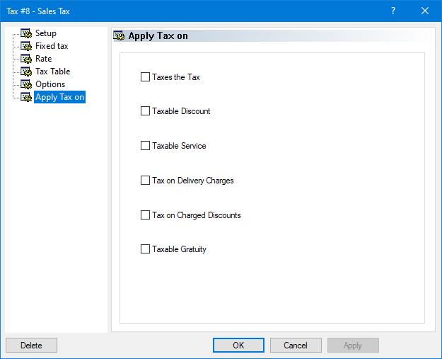 Enable this option to calculate the tax on Delivery Charges added to the check. If this option is disabled, the Delivery Charge will not be taxed.