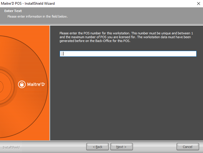 InstallShield Wizard - Computer Selection Type the workstation number for this POS and click Next >. Valid numbers are from 1 to the number of POS workstations you Maitre'D license has. For instance, if you purchased a license with 5 POS workstations, valid POS numbers will be from 1 to 5.
