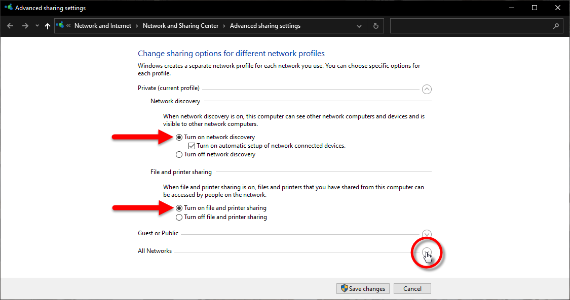 Private Network Profile Options Click on the down-arrow next to All Networks. This will display more options.
