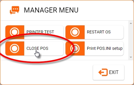 If the POS application is currently running, close it. If you have a keyboard connected, simply press ALT + F4 and the POS application will close. Otherwise, use a manager employee number to access the manager's menu and close the POS. (FUNCTION > Manager Menu > System Functions > Close POS).
