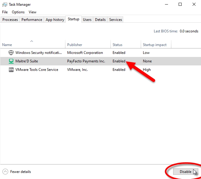 On the Task Manager window, click the Startup tab. The applications that start when Windows starts will be listed here. Select Maitre'D Suite from the list, and click the Disable button, in the lower-right corner.