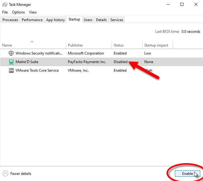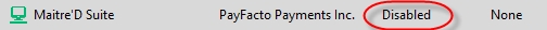 To re-enable automatic startup, simply follow the same steps. This time, when you select the Maitre'D Suite option, the button in the lower-right corner will say "Enable". Click it and the status will change back to Enabled.