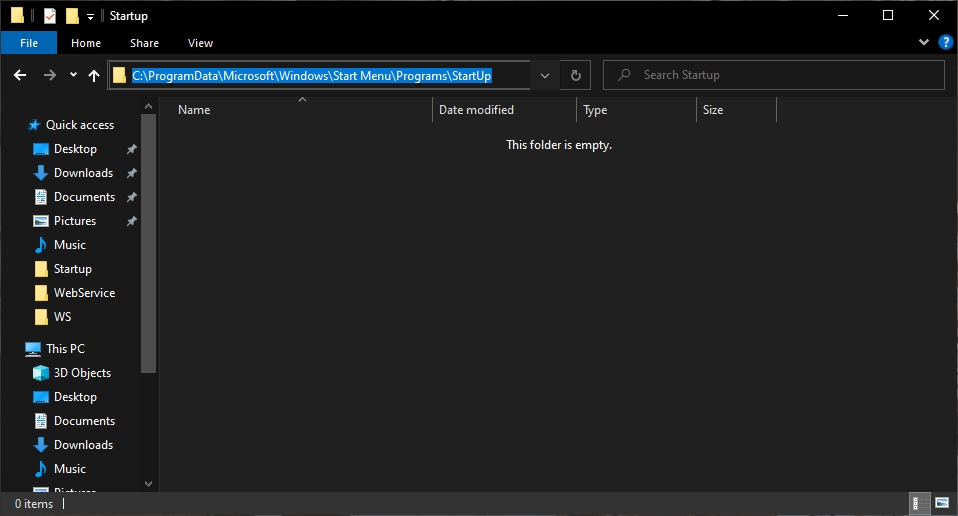 Using Windows File Explorer, browse to C:\ProgramData\Microsoft\Windows\Start Menu\Programs\Startup\. Note that you need to be able to see hidden files and folders.