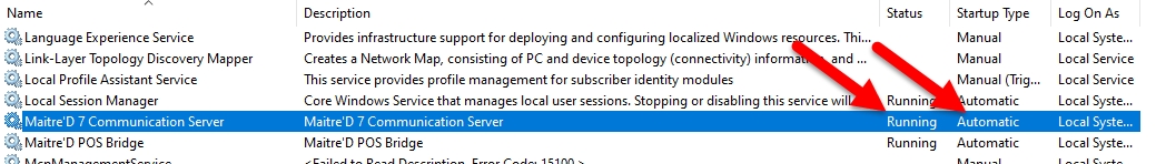 This confirms that the Maitre'D 7 Communication Server service is installed and running properly.