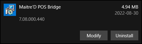 The fact that the Maitre'D POS Bridge application is listed here means that it is installed. Clicking on it will reveal more details. Make sure that the installed version corresponds to your version of the Maitre'D Back-Office software.