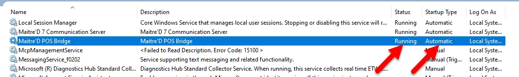 Follow this procedure to make sure that the Maitre'D POS Bridge service is up-and-running. Also make sure that the service is configured to start automatically when Windows starts.