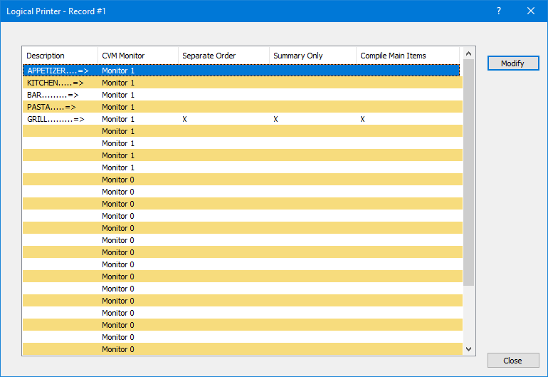 The advantage of setting up logical printers is that it is very easy to redirect an order to a new physical printer by just pointing the logical printer to the new physical printer instead of reconfiguring each revenue center and mode.