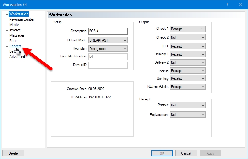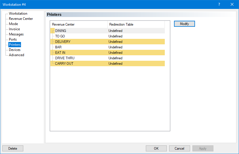After redirection tables are created, they can be assigned to each mode or revenue center for each workstation. This is done through the Workstation's options.