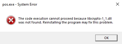 The code execution cannot proceed because libcrypto-1_1.dll was not found. Reinstalling the program may fix the problem.