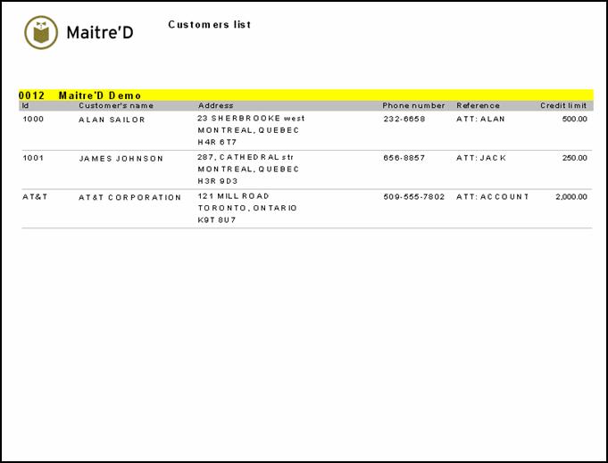 Maitre'D Customers list report provides with a list of all receivable accounts. It is sorted in a numerical and alphabetical order. The following is a sample of the customer list report: