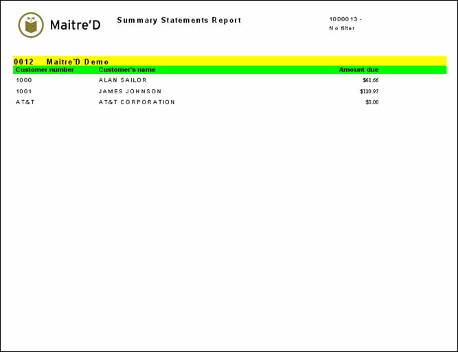 Maitre'D summary statement report provides you with a list of all accounts with outstanding balance. From the report filter window, select all customers or specific customers. The following is a sample of the summary statement report: