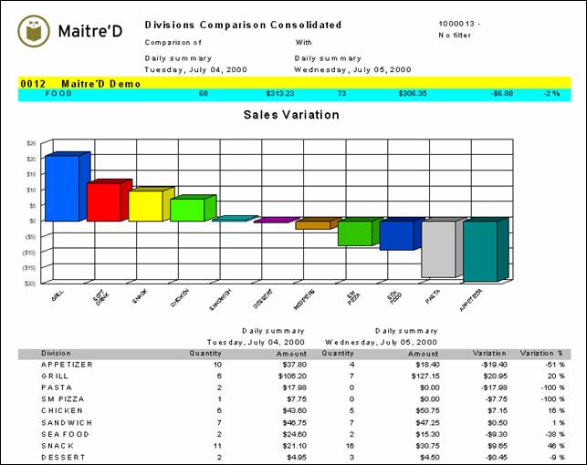 Maitre'D Divisions comparison consolidated report compares division gross sales by category. The graphic shows you the gross sales variation for the 2 dates or the 2 date range period selected. From a report filter window, you select the appropriate dates or date range, the appropriate comparison date or date range, category, division, Revenue Center and mode for the information needed. The following is a sample of the Division comparison consolidated report: