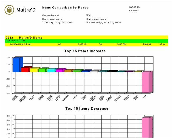 Maitre'D Items comparison by modes report compares item gross sales by category and mode for each Revenue Center. The graphic shows you the gross sales variation for the 2 selected date or the 2 dates range period. The graphic is divided in 2 sections: top 15 items increase and top 15 items decrease. One section provides you with 15 items that had the highest increase in variation and the second one provides you with 15 items that had the most decrease in variation. From a report filter window, you select the appropriate dates or date range, the appropriate comparison date or date range, category, division, Revenue Center and mode for the information needed. The following is a sample of the items comparison by mode report: