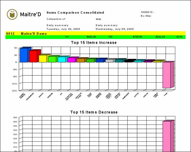 Maitre'D item comparison consolidated report compares the items gross sales. The graphic shows you the gross sales variation for the 2 dates or the 2 dates range period selected. The graphic is divided in 2 sections: top 15 items increase and top 15 items decrease. One section provides you with 15 items that had the highest increase in variation and the second one provides you with 15 items that had the most decrease in variation. From a report filter window, you select the appropriate dates or date range, the appropriate comparison date or date range, categories, divisions, Revenue Centers and modes for which you need information. The following is a sample of the items comparison consolidated report: