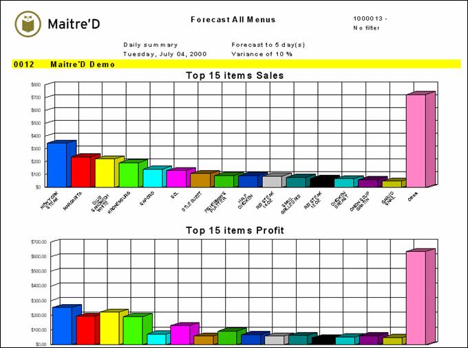 Maitre'D's item forecast consolidated report shows you your forecast sales and profit for the specific amount of days and variance needed. From the report filter window, you select the appropriate date selection, category, division, Revenue Center, mode and amount of days to include and variance needed. The graphic is divided in 2 sections: top 15 items sales and top 15 items profit. The first section provides you with the items with highest sales and the second one provides you with the items with the highest profit. Take note we only show the top 15 items. The following is a sample of the items forecast consolidated report: