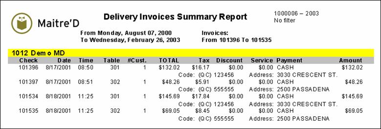 Maitre'D's delivery invoice summary report shows you a summary of the delivery invoice according to your specifications. From the report filter window, select the date and time range, amounts, invoices, tables, employees, items, promotions, medias, Revenue Centers, modes and customers to be included in the report. The following is a sample of the delivery invoice summary search report: