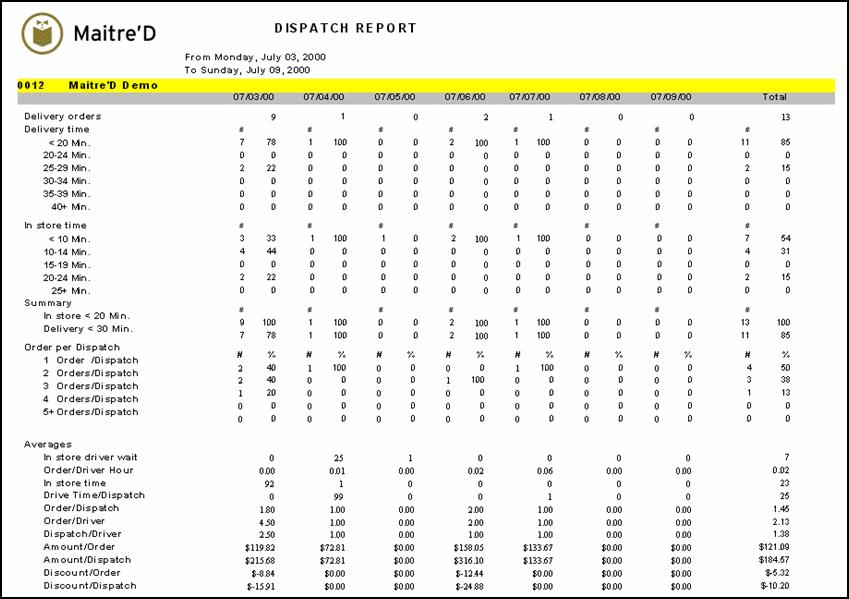 Maitre'D dispatch report provides you weekly pertinent information about your delivery operations such as delivery time, in store time, waiting time for drivers without orders. From the report filter window, select the appropriate week to be included in the report. You have the option to select the current week or the previous week.
