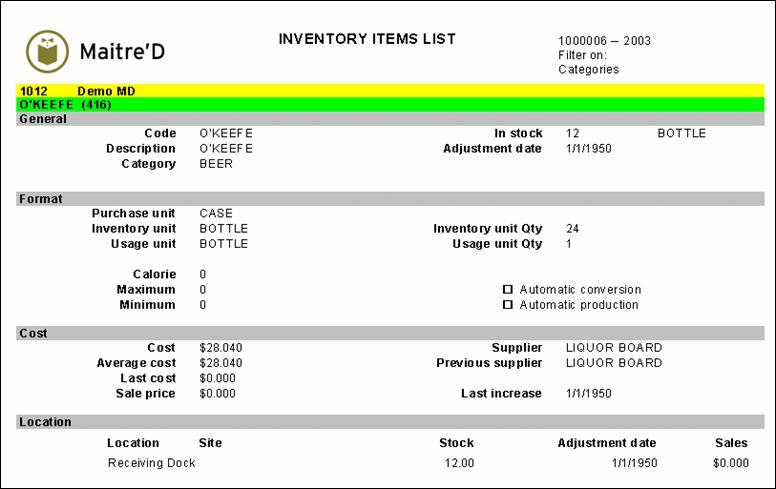 Maitre'D's items list report allows to print a single sheet for each inventory item providing all the information about this item. From the report filter window, select the items, units, locations, suppliers, categories, departments and groups to be included in the report. The following is a sample of the items list report: