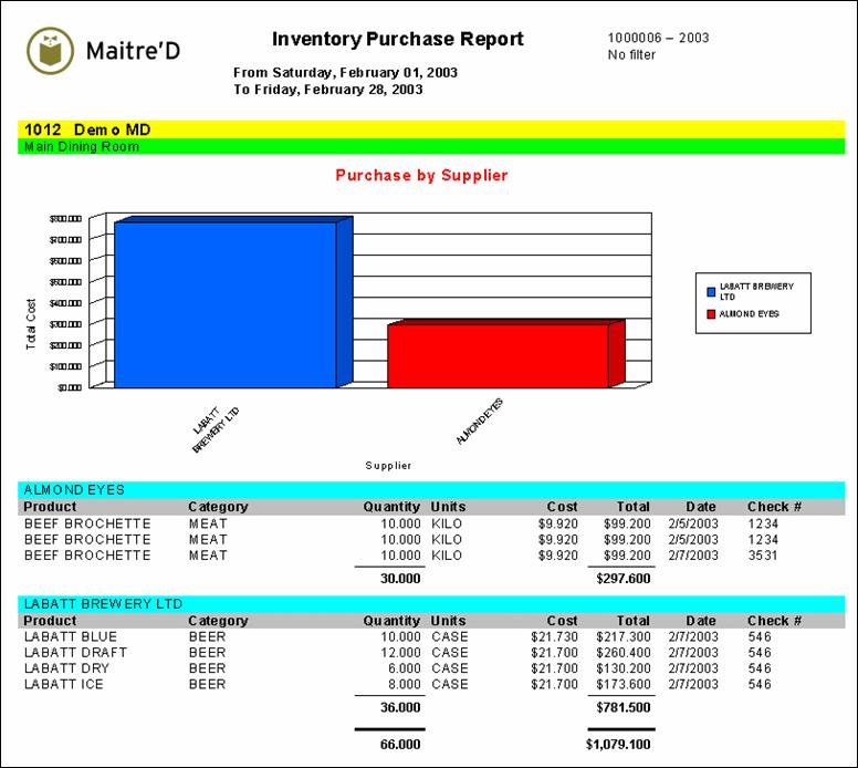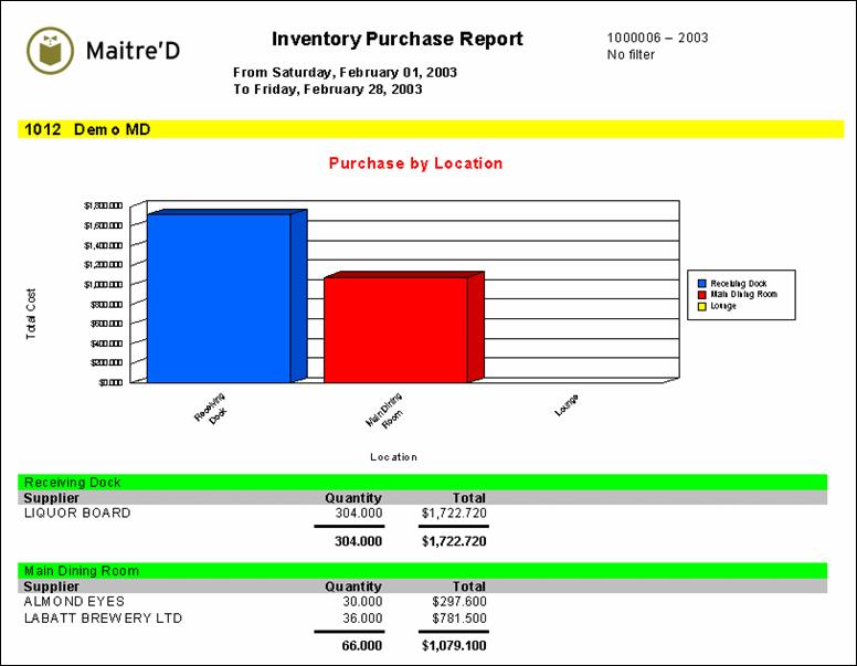 Maitre'D's purchase report shows you in graphics and numbers how the purchases affected the inventory quantities by suppliers and by locations. From the report filter window, select the dates, suppliers, locations, items, categories and groups to be included in the report. The following is a sample of the purchase report: