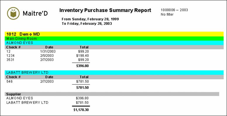 Maitre'D's purchase summary report shows you a summary of purchases that affected the inventory quantities according to your specifications. From the report filter window, select the dates, suppliers and locations to be included in the report. The following is a sample of the purchase history report: