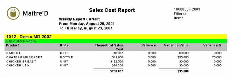 Maitre'D's Sales Cost Report shows information on the sales cost per inventory item and the differences between the real and the theoretical used quantities. This report is available on a weekly, periodic and monthly basis for the current and past time period. From the report filter window, select the appropriate period, suppliers, inventory items, categories, groups, locations and departments to be included in the report. The following is a sample of the sales cost report: