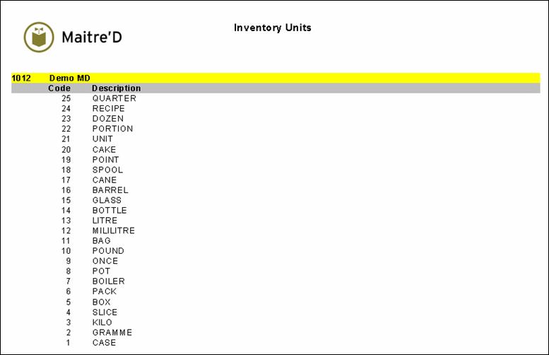 Maitre'D's units report shows you all format units used as purchase, inventory or usage format in inventory items. The following is a sample of the units report: