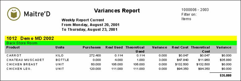 Maitre'D's Variances Report shows inventory variances. The variance is the difference between the theoretic and real quantity used according to your inventory adjustment. This report is available on weekly, periodic and monthly basis. From the report filter window, select the appropriate period, suppliers, inventory items, categories, groups, locations, departments and amounts to be included in the report. The following is a sample of the variances report: