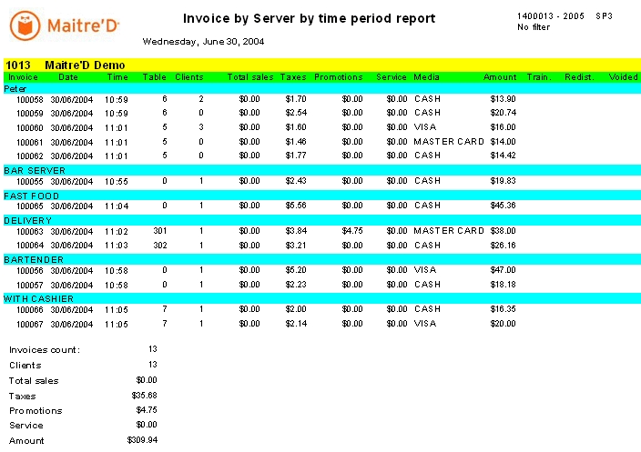 Maitre'D by server by time period report is an invoice report that provides all invoices (checks) for a specific time frame, separated by server. From the report filter window, select the date and time range and employees to be included in the report. The following is a sample of the by server by time period report: