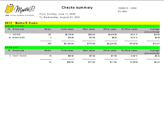 Maitre'D check summary report provides you with a summary of the total check sales (gross sales before any discounts, service charge and taxes), meal sales and an average $ amount per check for specific employees and Revenue Centers. From the report filter window, select the appropriate date and time range, Revenue Center and employees to be included in the report. The following is a sample of the check summary report: