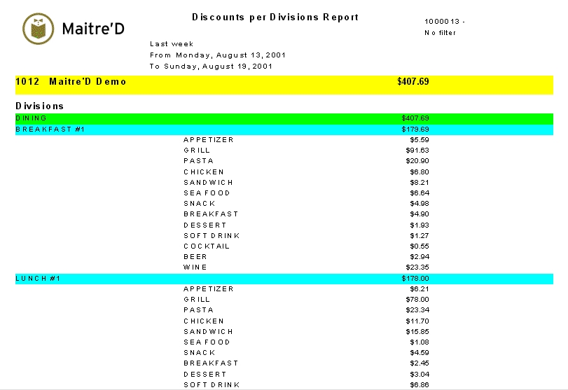 Maitre'D's Discount report per Divisions, provides you with a list of all discounts made per division for the selected date or date range. It gives the date and time the discount was applied to the check. From the report filter window, select the appropriate date and date range, promotion (discount) and employees to include in the report.